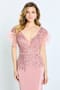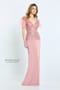 A sleeveless sheath crepe gown with the perfect touch of glamlour. The gown features a plunging v-neckline, a see-through beaded dropped waist bodice, and a v-back. Separate tulle flutter sleeves, shawl, and bodice liner included.