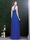 Full length lux chiffon dress with modified halter neckline and draped bodice. Rhinestone broach detail at neckline. Shirred inset waistband at natural waist. Shirred skirt with center front slit.
