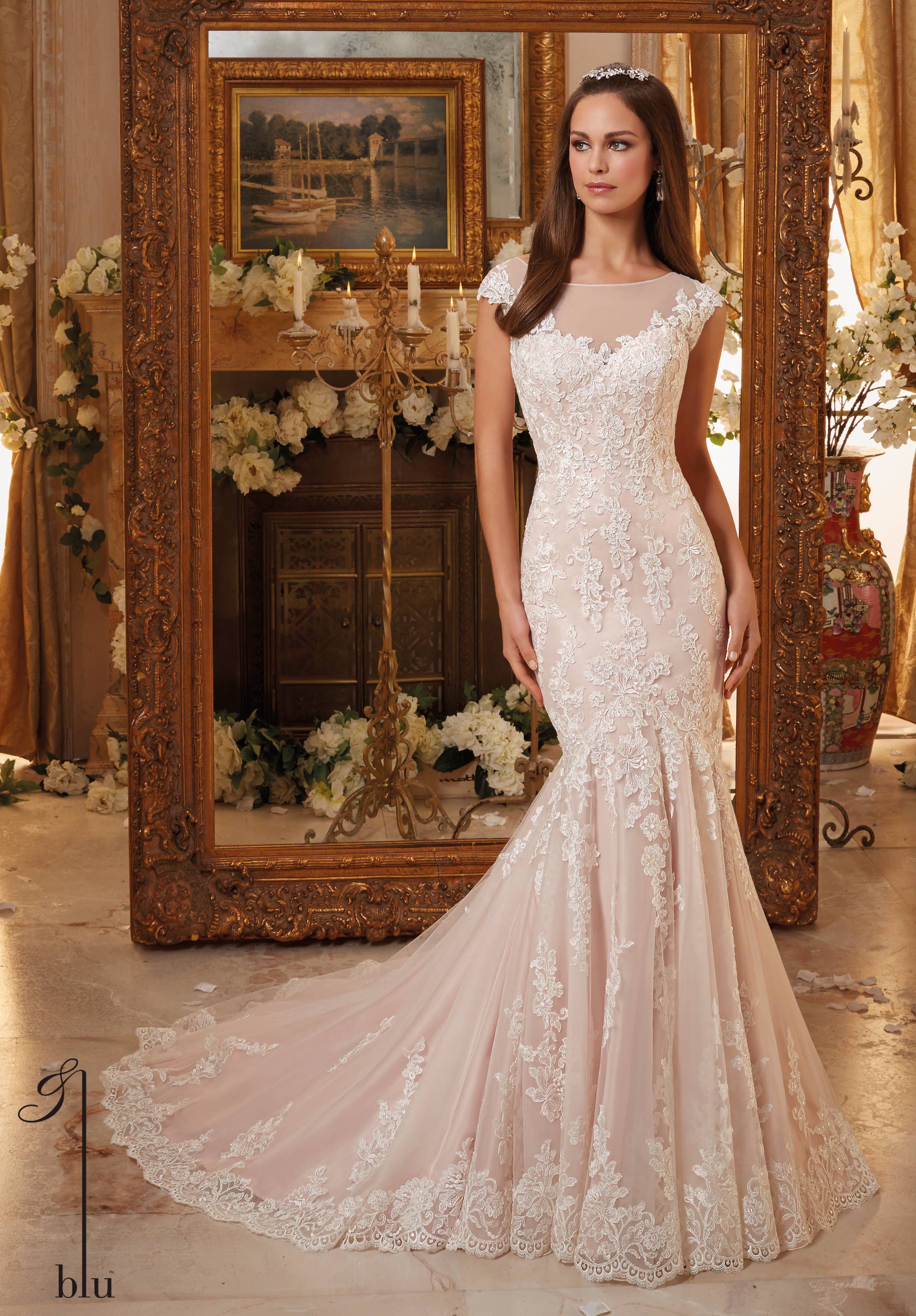 Mori Lee Blue FALL 2016 Collection: 5466 - Vintage Embroidered Lace on Soft Net Gown with Scalloped Hemline Gown