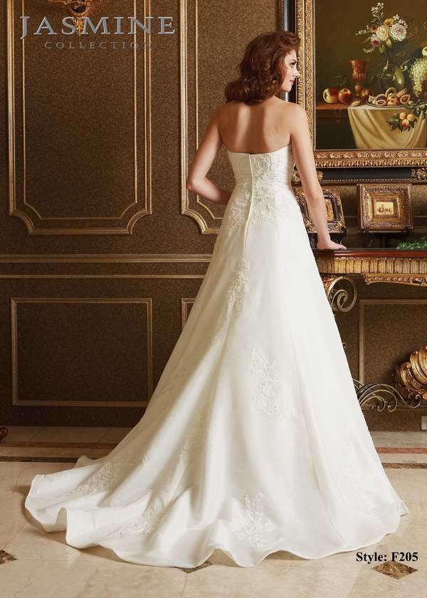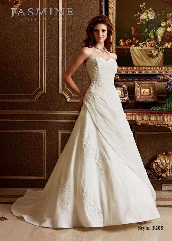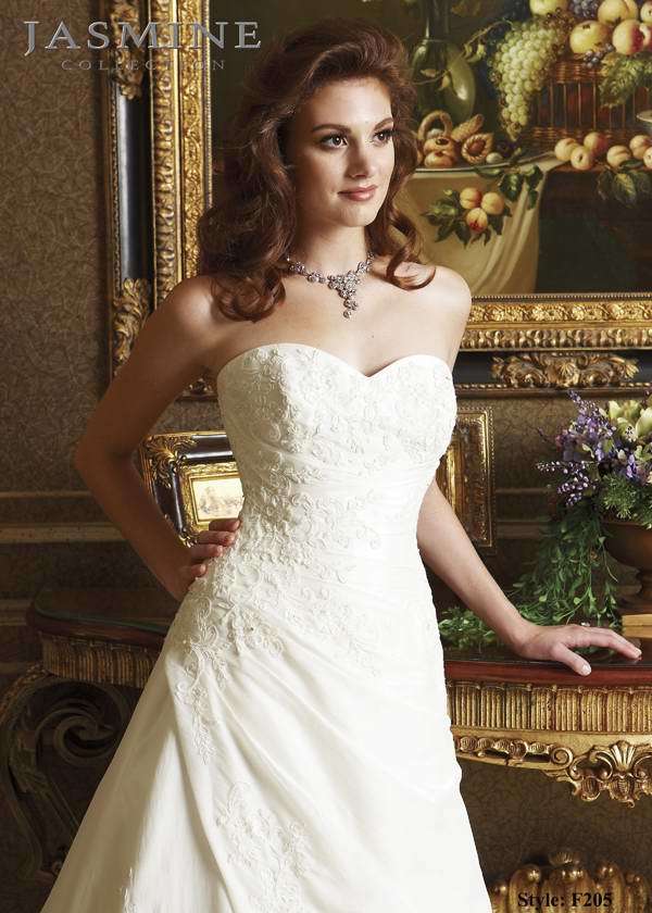 Silhouette: Sweetheart strapless A-line gown detailed with beaded lace.