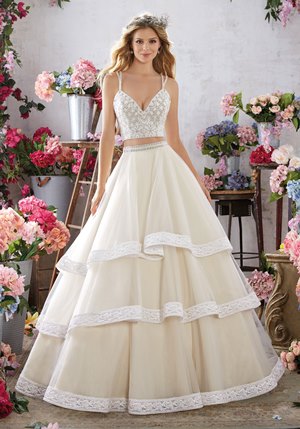 Mori Lee Voyage SPRING 2017 Collection: 6859 - Meredith - Two-Piece Crystal Beaded Bodice with Tiered Tulle Skirt Edged with Lace Gown