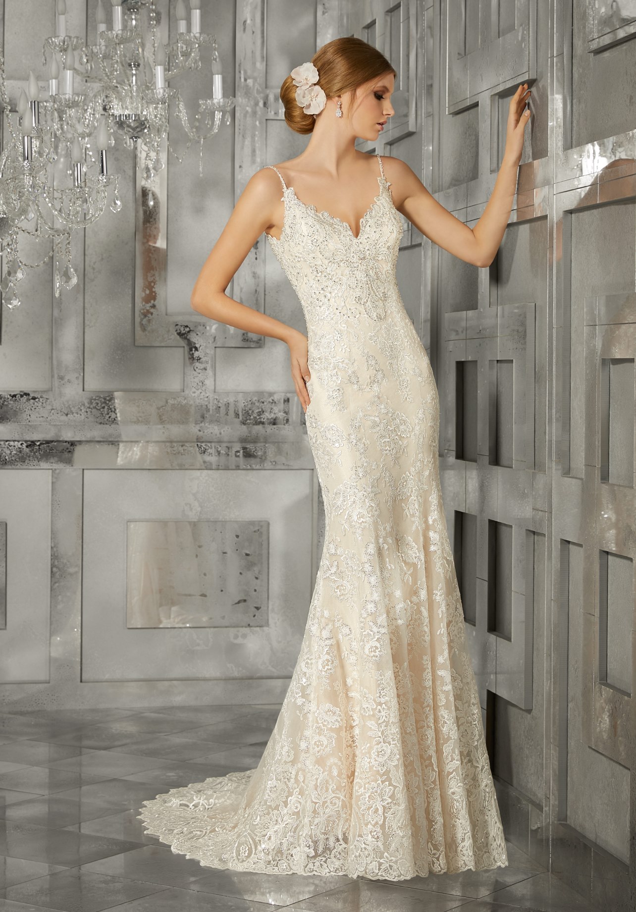 Mori Lee Bridal FALL 2017 Collection: 8191 - Meralda - Diamanté Beading on Embroidered Lace Appliqués with Wide Scalloped Hemline on Soft Fit and Flare Gown