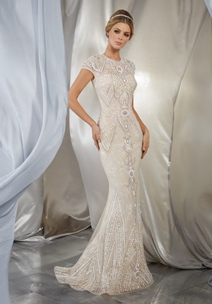 Mori Lee Voyage FALL 2017 Collection: 6869 - Musidora - Intricately Delicate Beading on Slim, Tulle Gown Over Chantilly Lace Gown