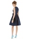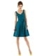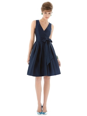 Cocktail length sleeveless dupioni dress with surplice neckline and matching sash at natural waist. Full pleated skirt with pockets at side seams.