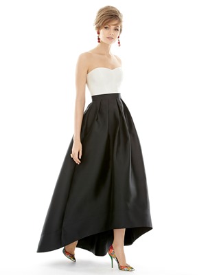 Full length strapless sateen twill dress with sweetheart neckline and hi-low hem detail. 1.5" self belt at natural waist. Belt always matches skirt. Pockets at side seams of pleated full skirt. Sizes available: 00-30W, and 00-30W extra length.