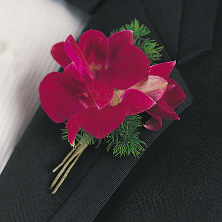 This kind of boutonniere displays the distinctness and uniqueness of an orchid. It comes with streaks of tiny green leaves and minute twigs as a backdrop to draw attention to the shape and especially the color of the flower. Even with its vibrant shade of fuschia, it is neither loud nor ostentatious, but adds flair to all dark suits and complements the entire ensemble of the wedding entourage. All pieces are put together to make a finished and polished look for that long and lasting wedding impression. This boutonniere goes well for functions held at any time of the day.