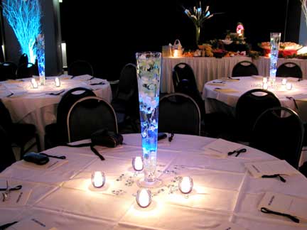 Surround your guests with a soft and mysterious aura with this symphony of flower and light. The package includes a lone white orchid and blue light inside the vase with tea lights around it. It looks almost like something that comes from a futuristic movie, but will probably be advisable to use only during nighttime occasions for it to be fully appreciated. There are no specials options for this, but the simple elegance will be suitable for formal dinners and spiff it up with that new age look. A few blue lights around the event area will add to the effect.
