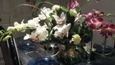 Orchids and aspidistra leaves in a brandy vase.
