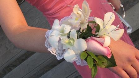 1 pink rose, 4 white orchids , white ribbon, pearls and greenery.